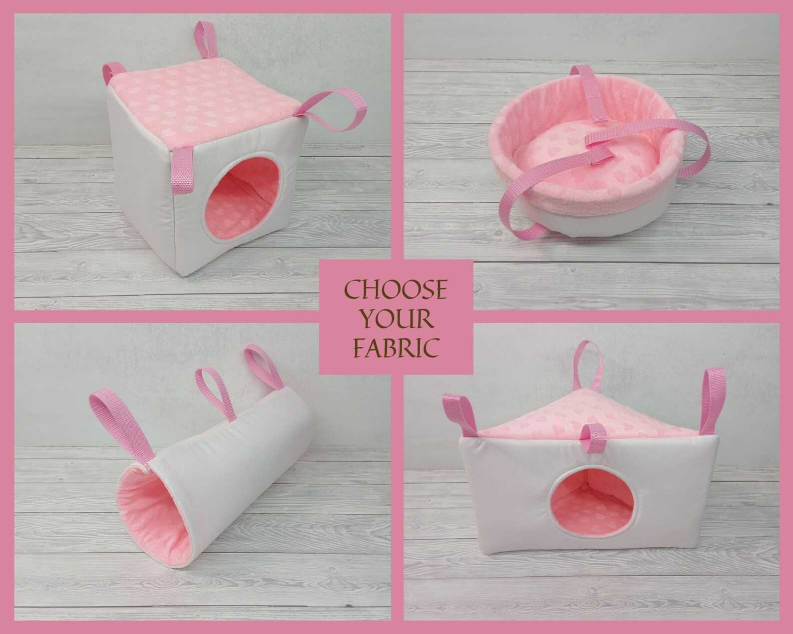 Domek trójkąt i  szyty domek kostka – bezpieczna kryjówka, w której zwierzak może odpocząć i poczuć się komfortowo.