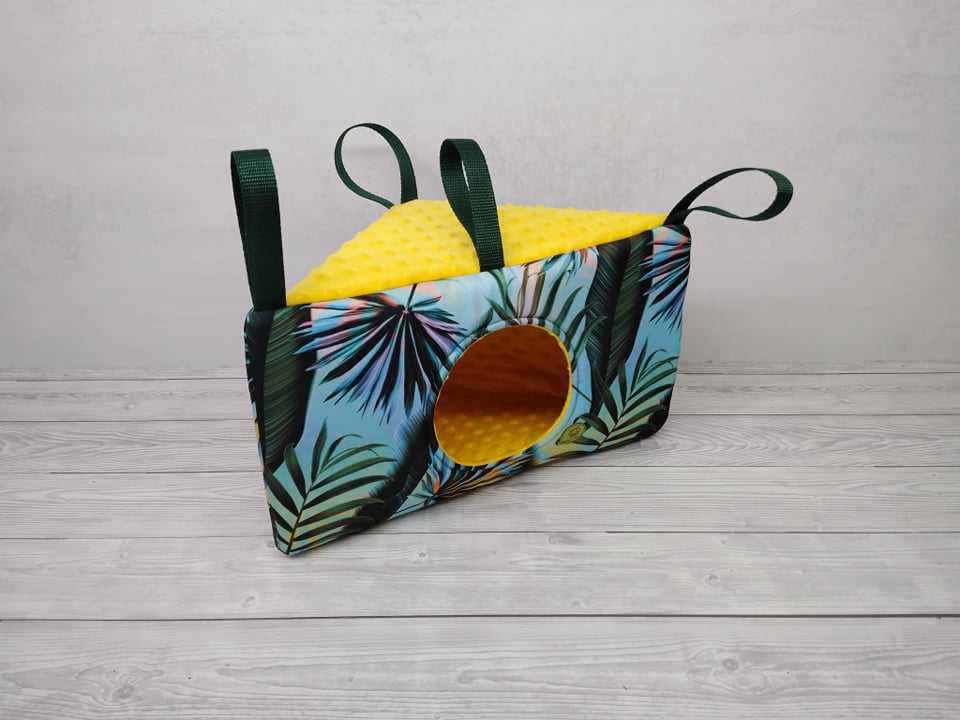 Trójkątny wiszący domek narożny, wykonany z miękkiej tkaniny, to doskonałe rozwiązanie dla świnki morskiej, szynszyli, fretki, szczura oraz innych małych zwierząt. Jego specjalny kształt pozwala na umieszczenie go w narożniku klatki, co oszczędza miejsce i tworzy przytulne schronienie dla pupila.